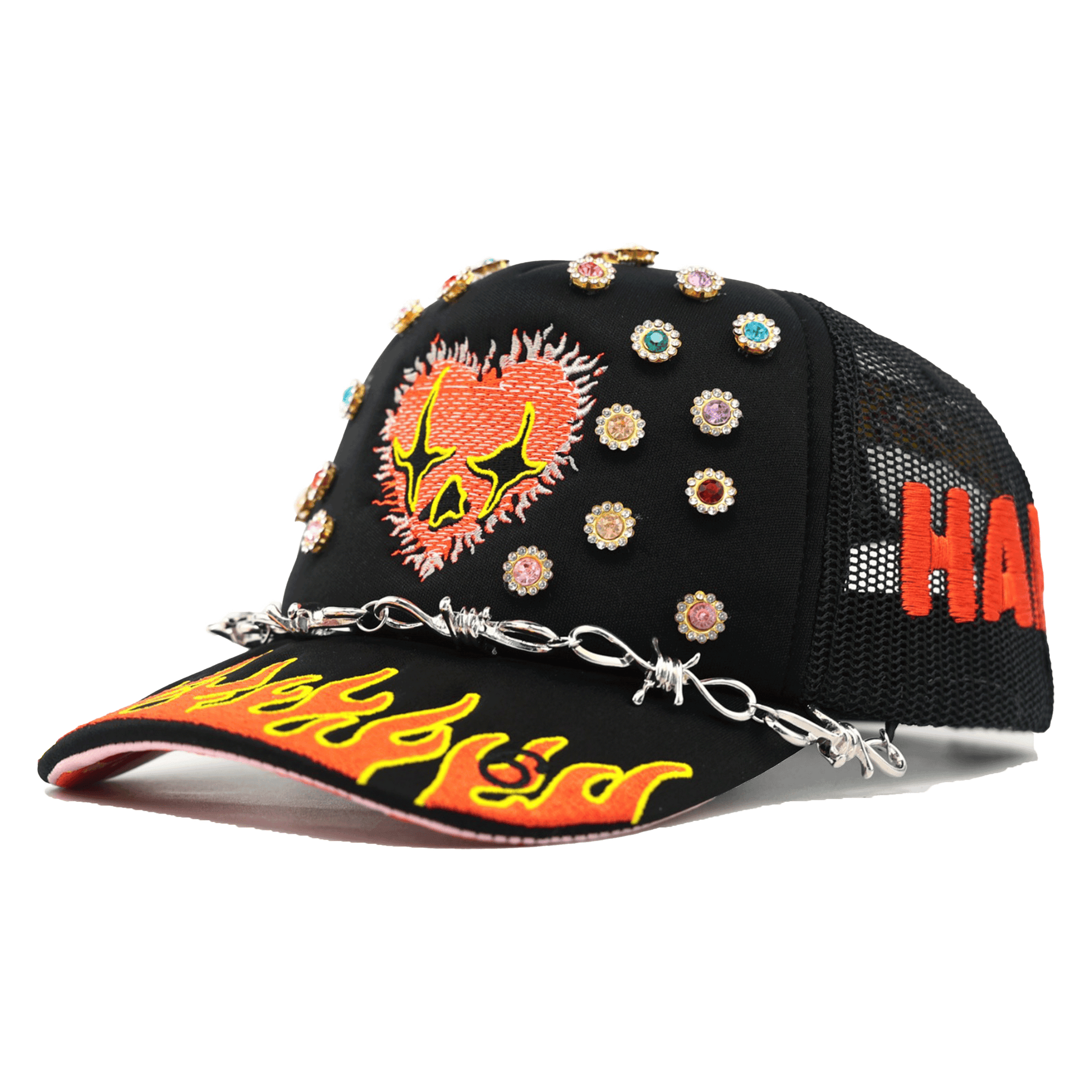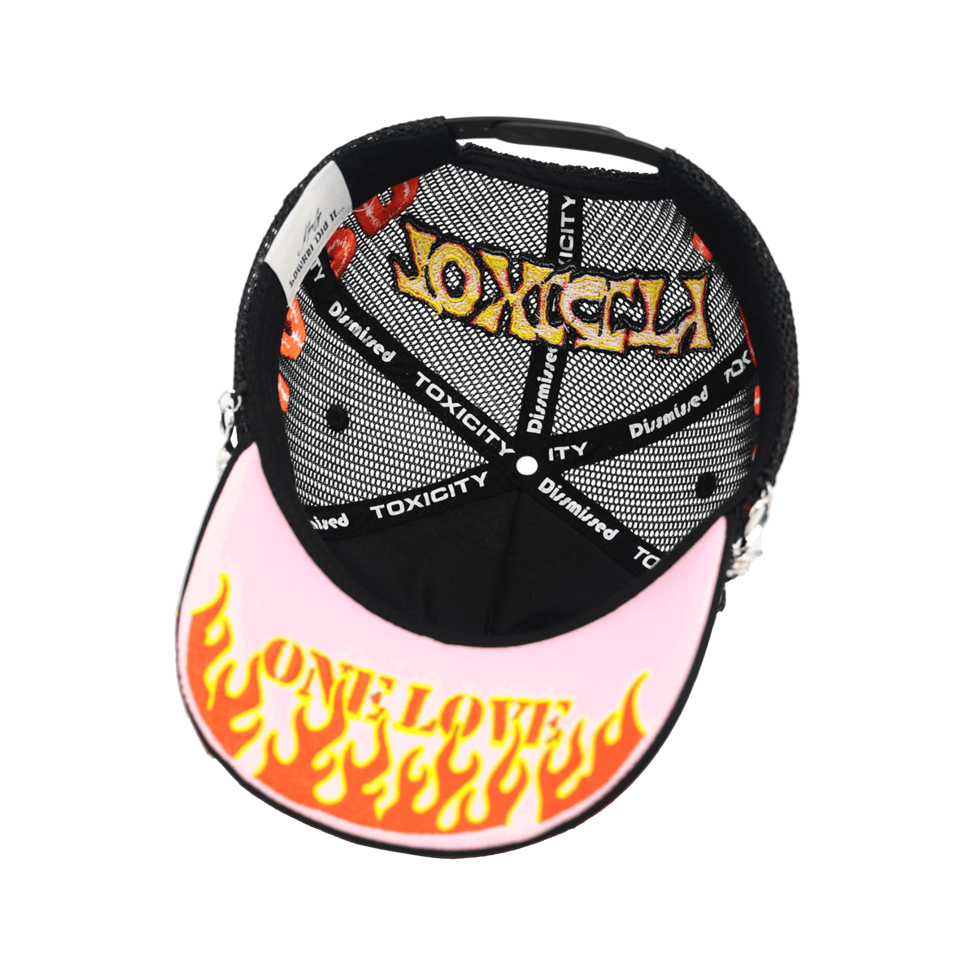 The Love Hard Trucker Hat features embroidery across every panel, topped with a stainless steel barbed wire chain at the front. Bold "LOVE HARD" stitching lines both sides, while a flaming heart with the signature Toxicity face takes center stage. Vibrant rhinestones, each framed by "diamond" stones, cover the front panels surrounding the heart. The angel number 6 on the left brim urges focus and course correction to reach your goals, while the flames symbolize burning away toxic obstacles. With “One Love” stitched below, this hat dares you to embrace your journey with fierce passion and fearless determination.
