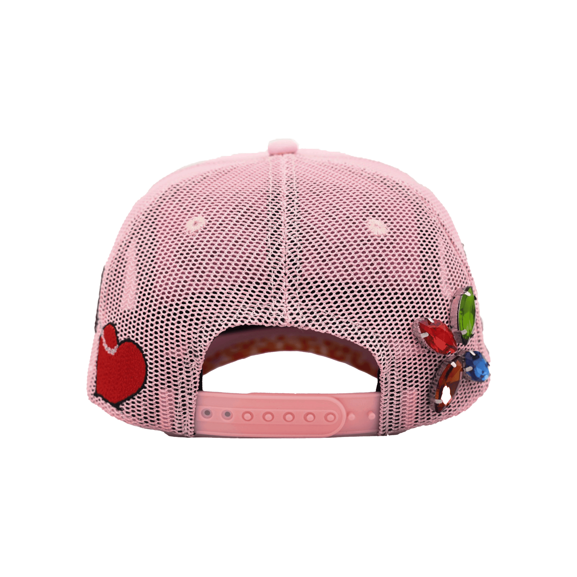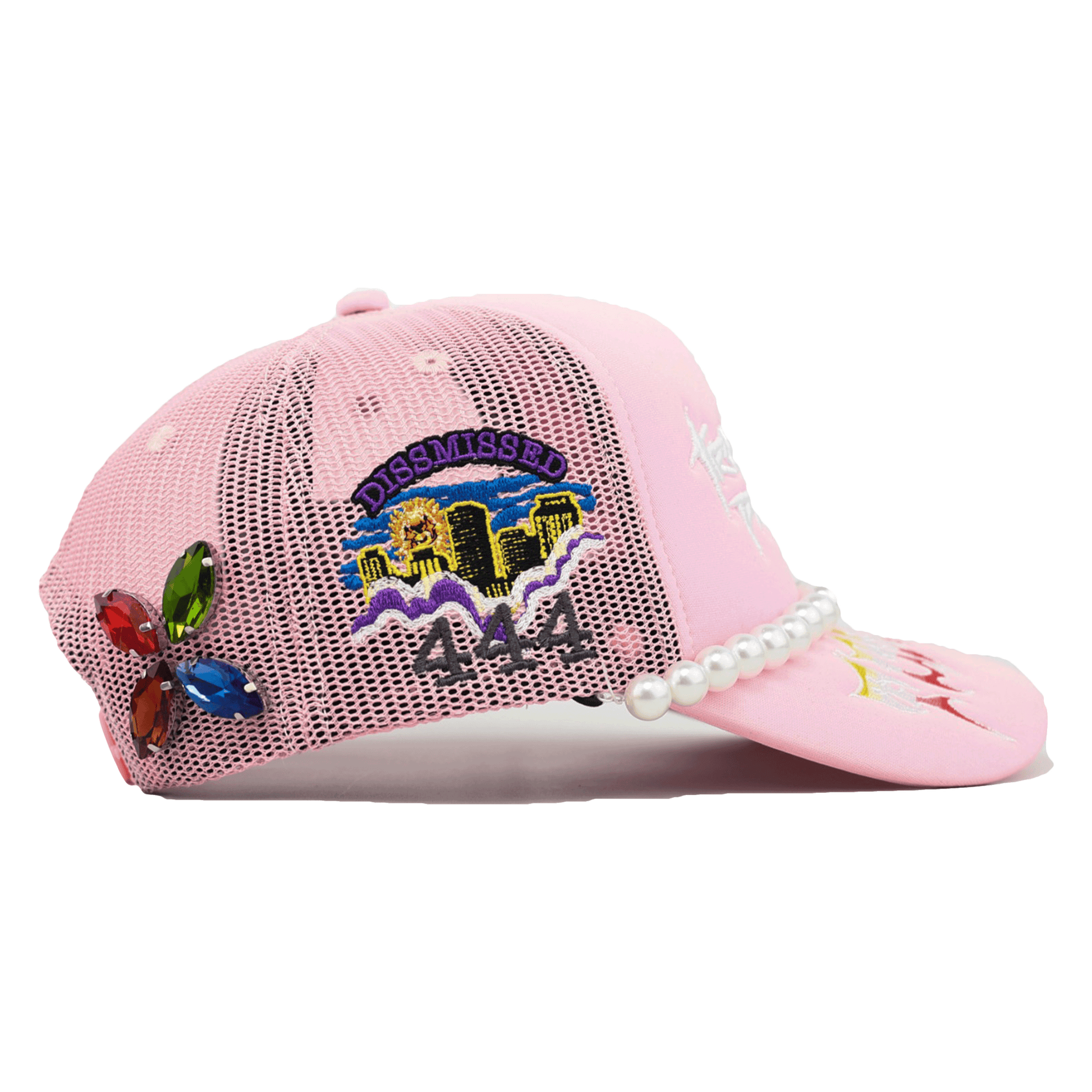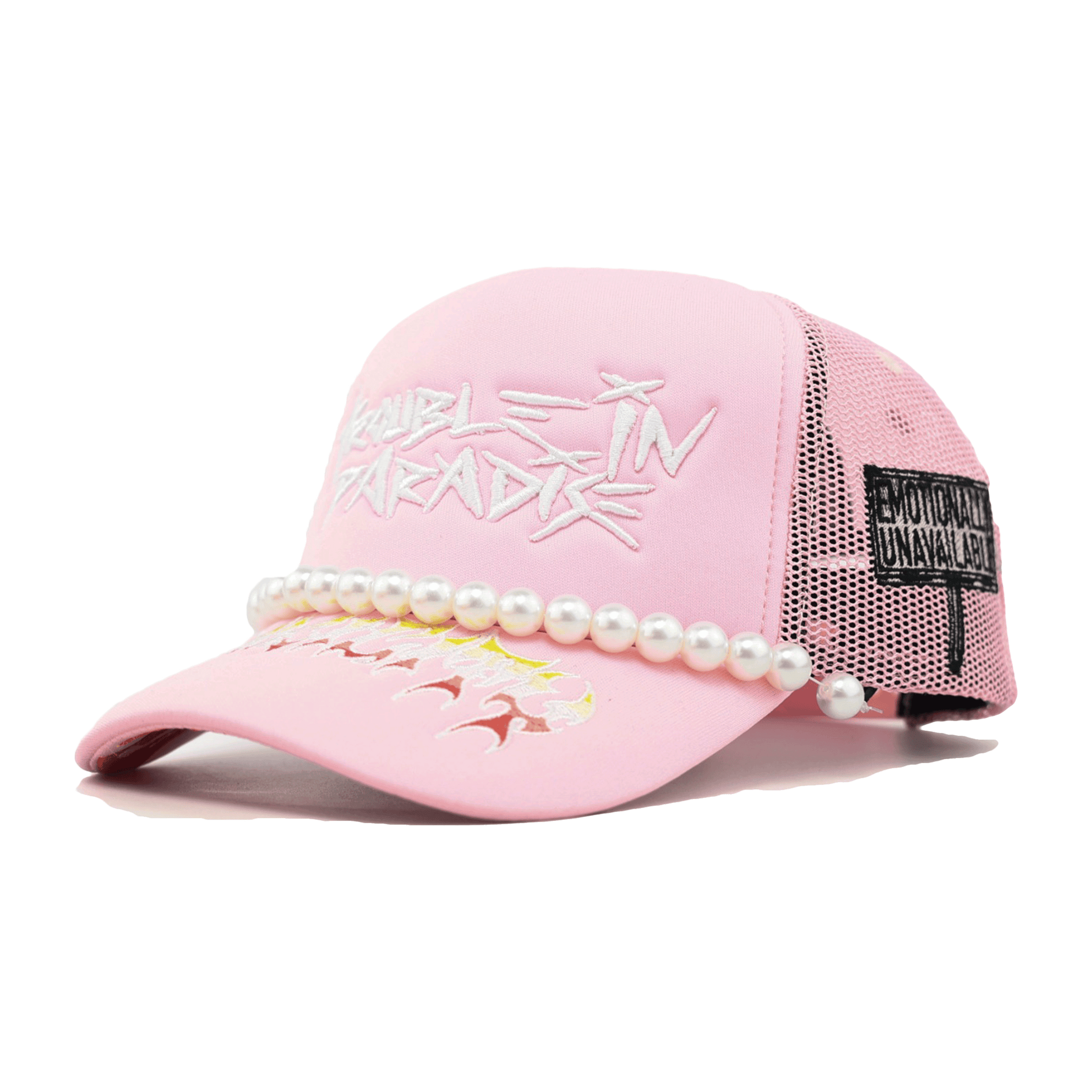 The Trouble in Paradise Trucker Hat demands attention with bold embroidery across every panel and a striking pearl chain gracing the front. The right panel boasts the powerful angel number 444, a fierce emblem of strength and guidance on your path. A chained heart symbolizes relentless focus, while four marquise-cut rhinestones near the snap closure urge you to keep shining bright. With “Toxicity” boldly stitched atop the bill and “One Love” below, this hat challenges you to own your journey with passion and fearless love.