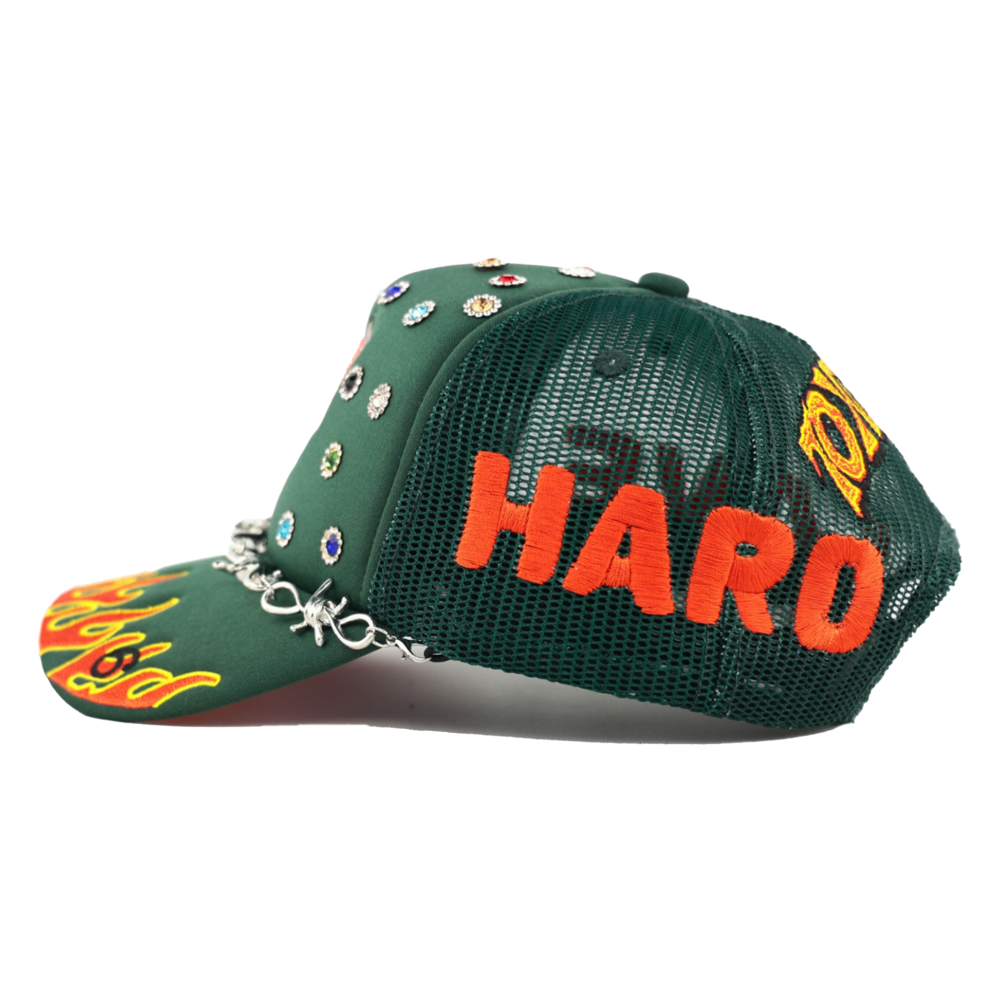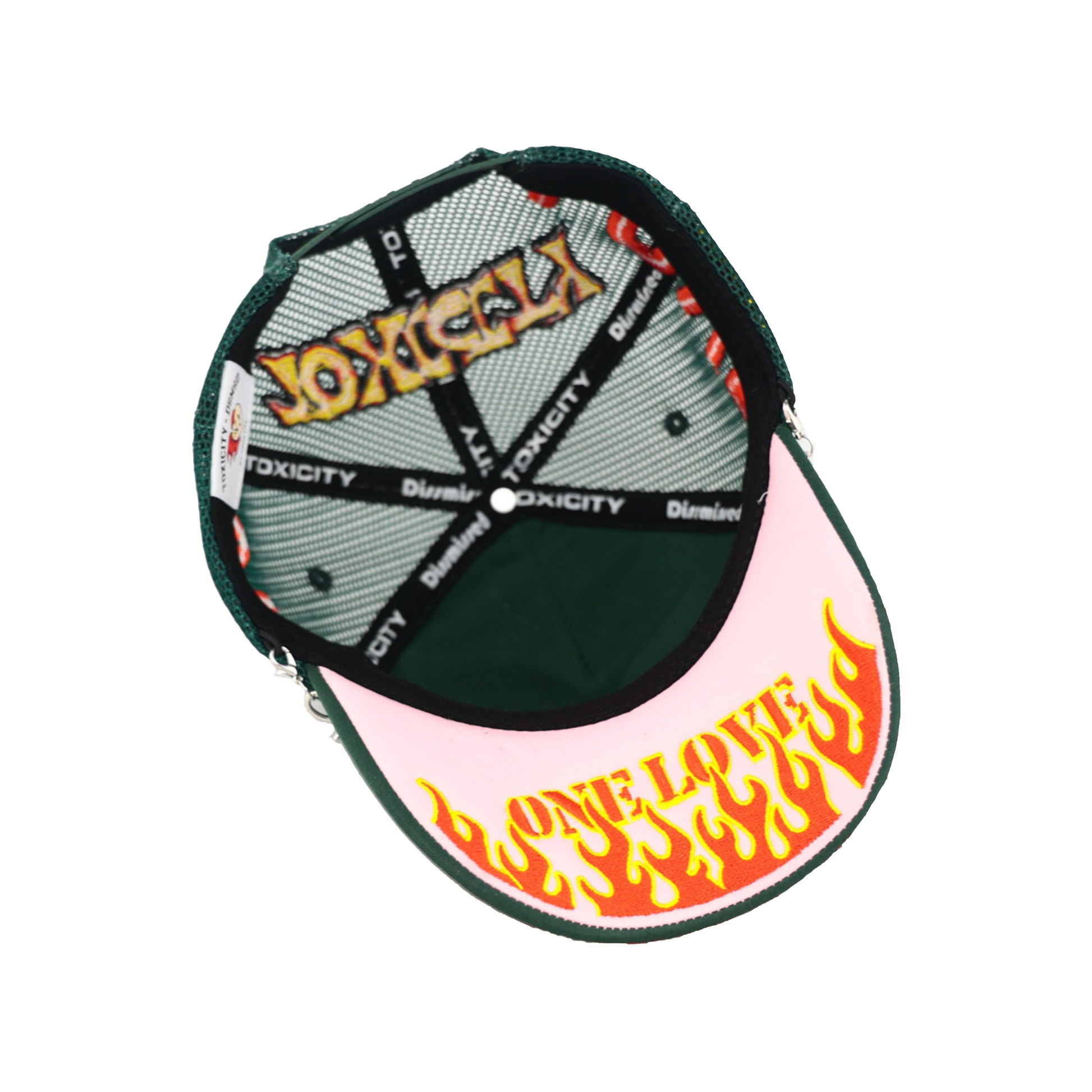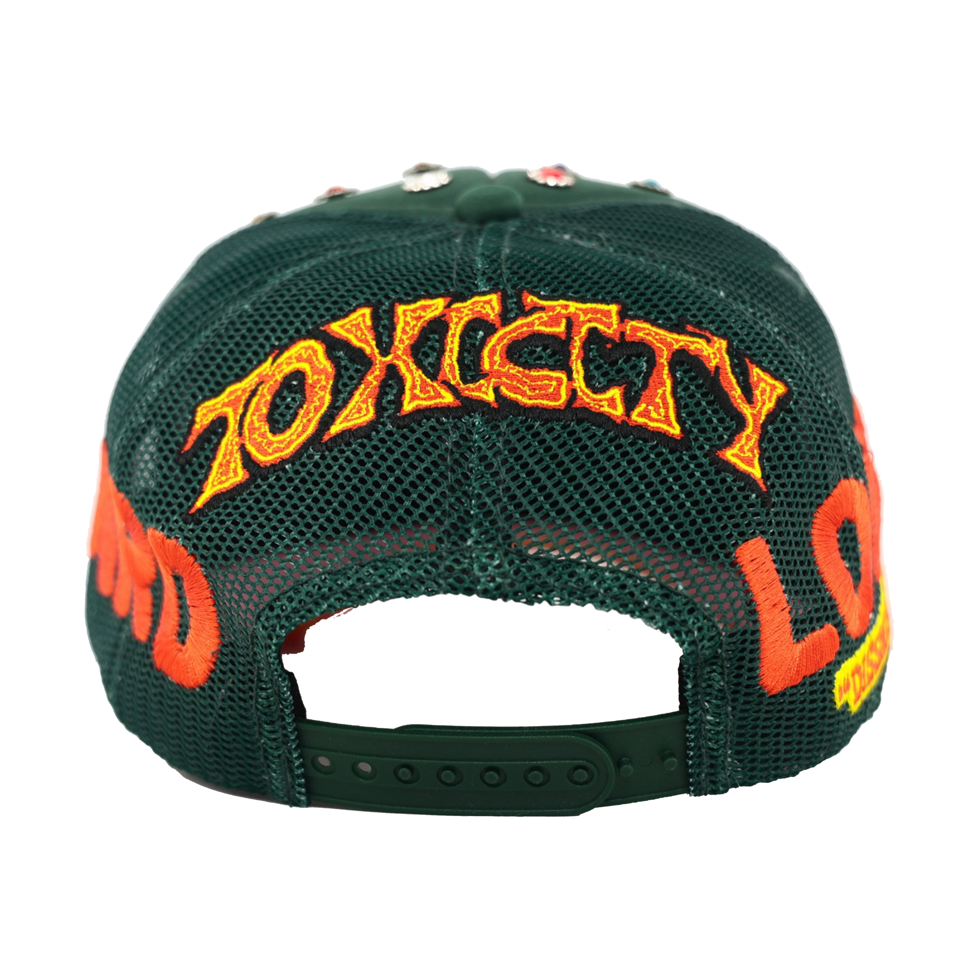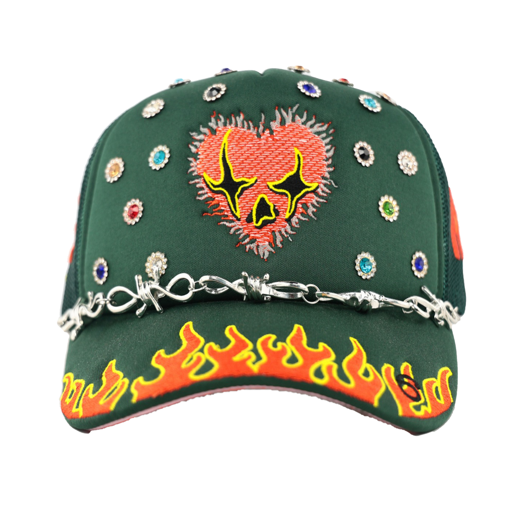 The Love Hard Trucker Hat features embroidery across every panel, topped with a stainless steel barbed wire chain at the front. Bold "LOVE HARD" stitching lines both sides, while a flaming heart with the signature Toxicity face takes center stage. Vibrant rhinestones, each framed by "diamond" stones, cover the front panels surrounding the heart. The angel number 6 on the left brim urges focus and course correction to reach your goals, while the flames symbolize burning away toxic obstacles. With “One Love” stitched below, this hat dares you to embrace your journey with fierce passion and fearless determination.