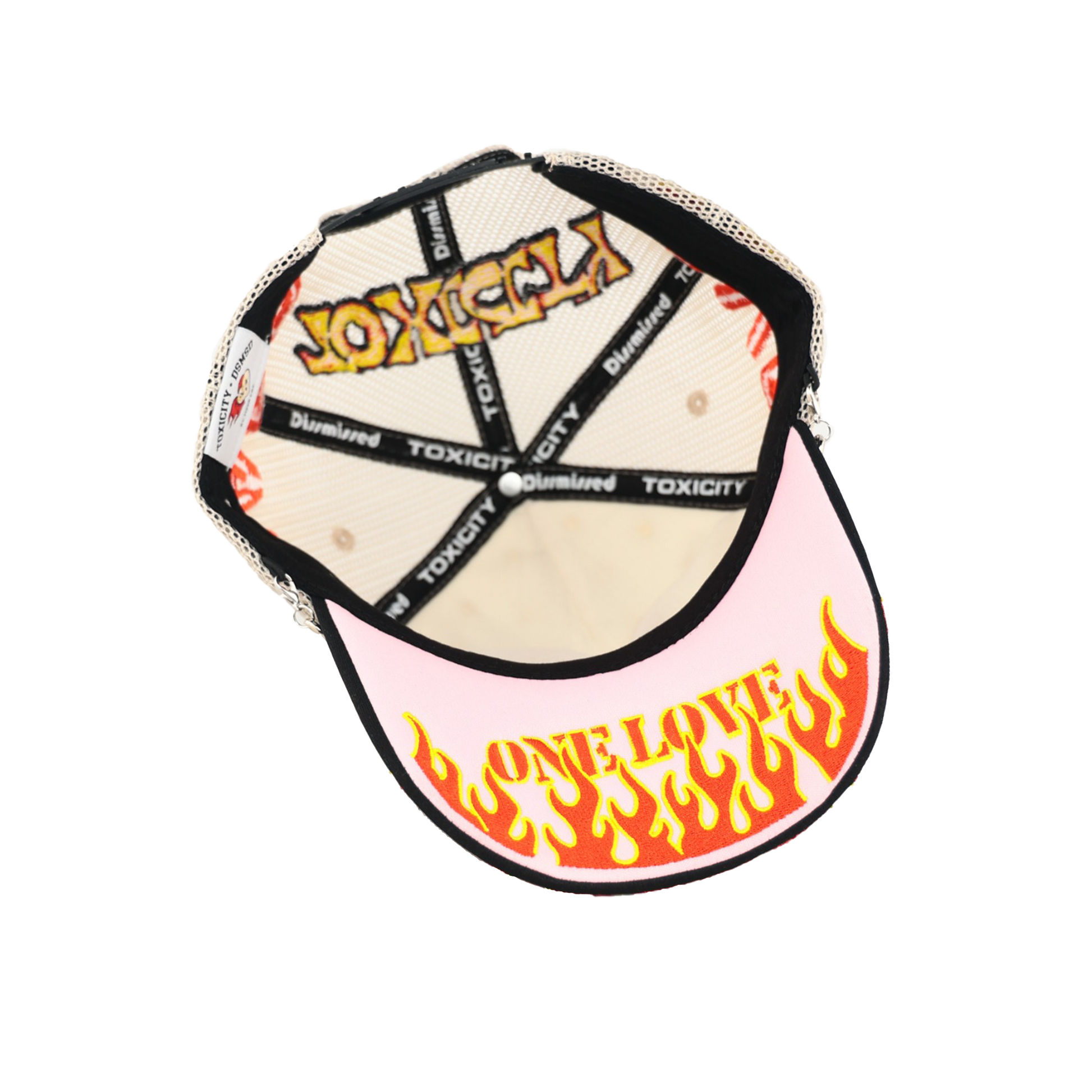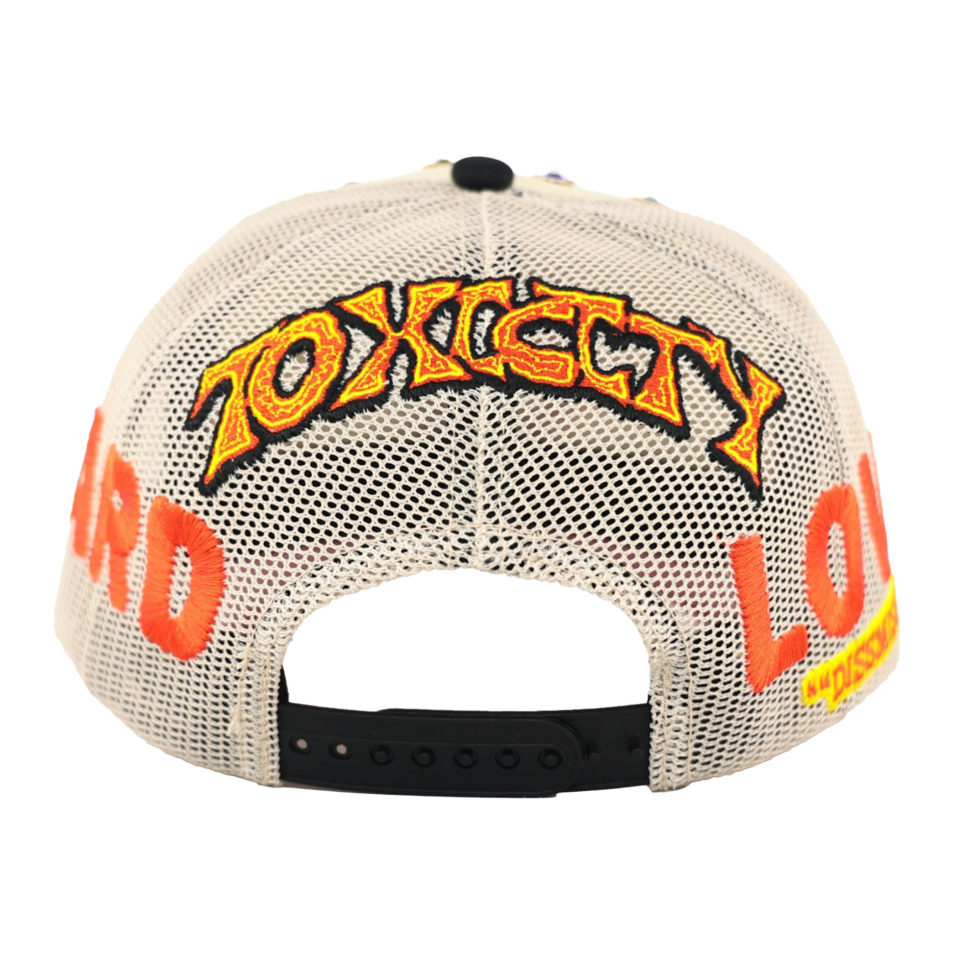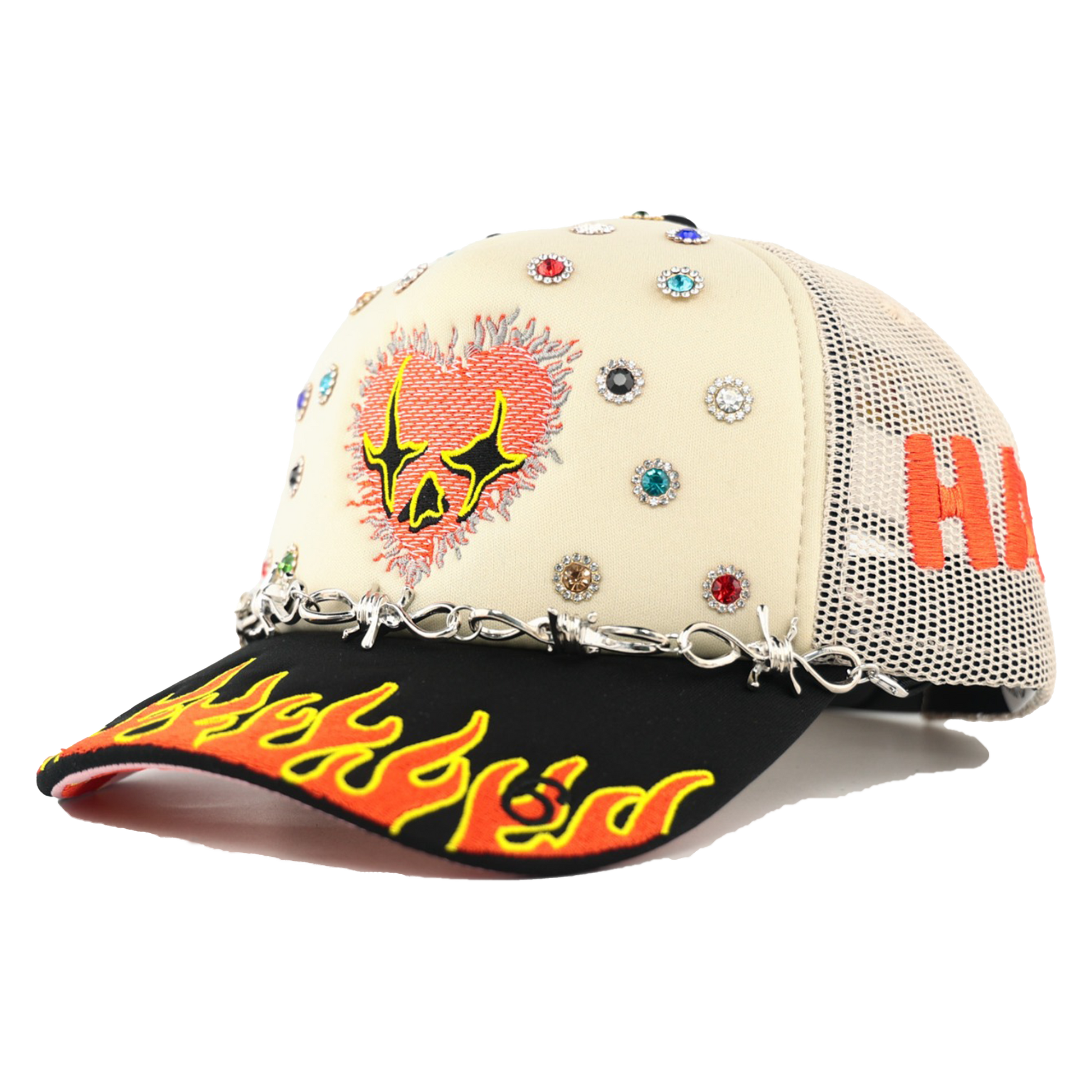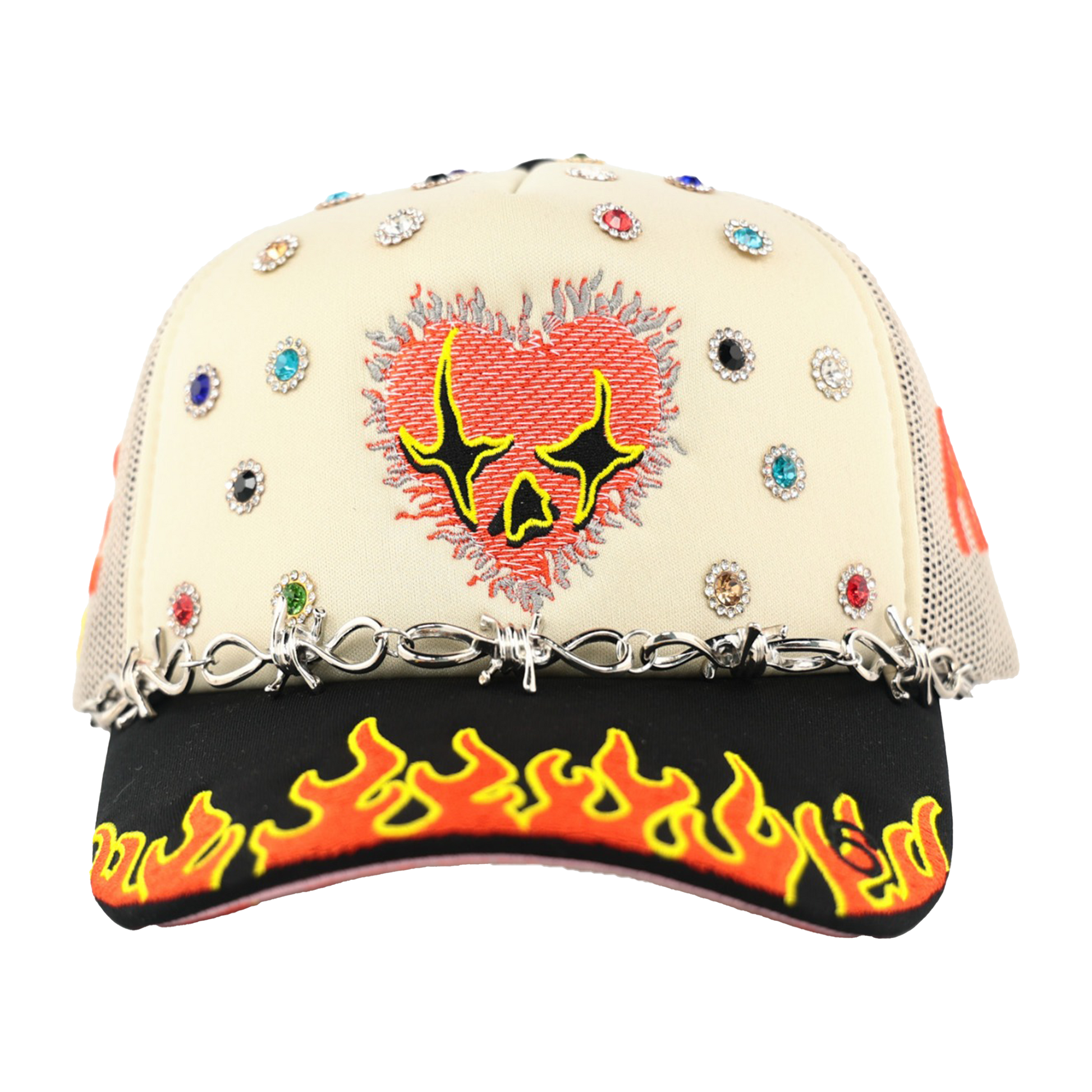 The Love Hard Trucker Hat features embroidery across every panel, topped with a stainless steel barbed wire chain at the front. Bold "LOVE HARD" stitching lines both sides, while a flaming heart with the signature Toxicity face takes center stage. Vibrant rhinestones, each framed by "diamond" stones, cover the front panels surrounding the heart. The angel number 6 on the left brim urges focus and course correction to reach your goals, while the flames symbolize burning away toxic obstacles. With “One Love” stitched below, this hat dares you to embrace your journey with fierce passion and fearless determination.