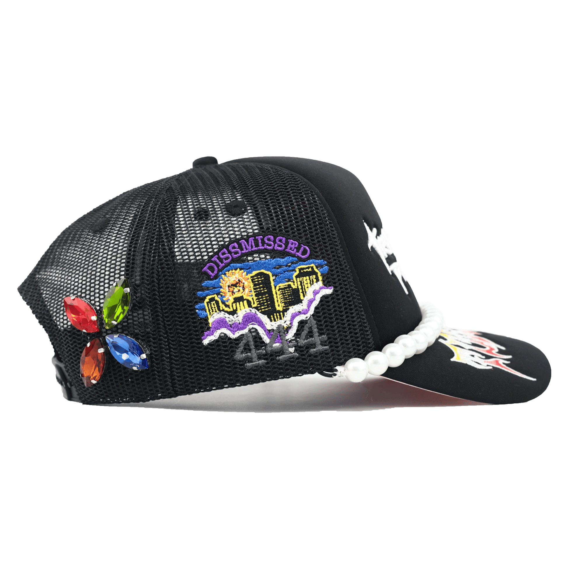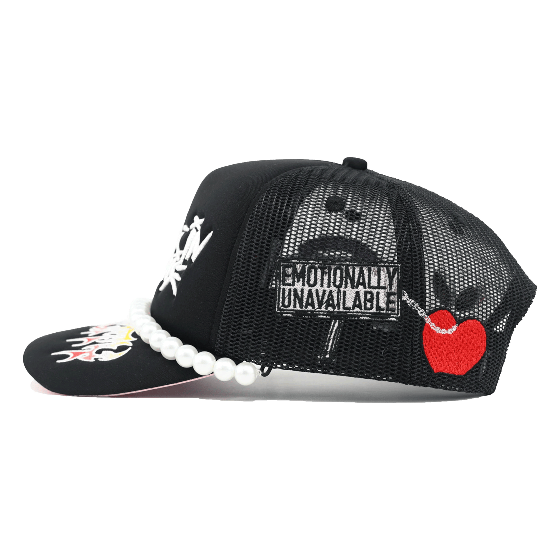 The Trouble in Paradise Trucker Hat demands attention with bold embroidery across every panel and a striking pearl chain gracing the front. The right panel boasts the powerful angel number 444, a fierce emblem of strength and guidance on your path. A chained heart symbolizes relentless focus, while four marquise-cut rhinestones near the snap closure urge you to keep shining bright. With “Toxicity” boldly stitched atop the bill and “One Love” below, this hat challenges you to own your journey with passion and fearless love.